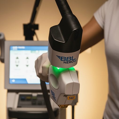 Broadband light is delivered to the skin to selectively target pigmentation, redness, and sun damage without harming surrounding tissue.